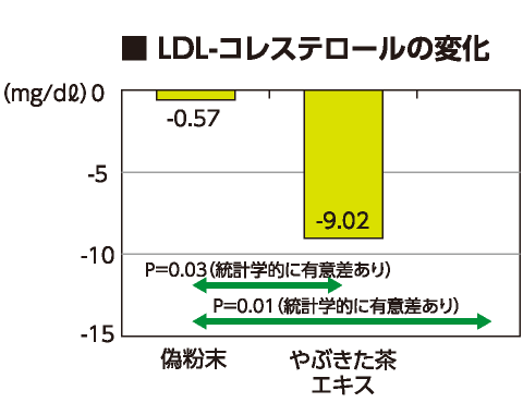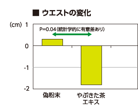 試験の結果、掛川茶エキス粉末のグループでは、LDL-コレステロールの値が平均9.02㎎/dl減少し、ウエストも平均1.86㎝細くなりました。